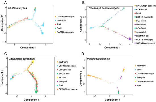 Differentiation trajectories of peripheral immune cells in testudines. (A) C. mydas; (B) Trachemys scripta elegans; (C) C. carbonaria; and (D) P. sinensis.