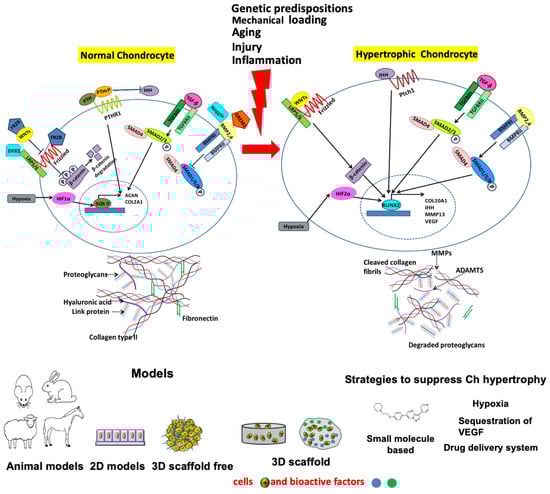 Schematic describing the review summary; the differences in the normal and hypertrophic chondrocyte in terms of active cellular signaling pathways corresponding to healthy ECM and degraded ECM, respectively; models that have been utilized to simulate OA specific hypertrophy; and the basis of the strategies to suppress hypertrophy.