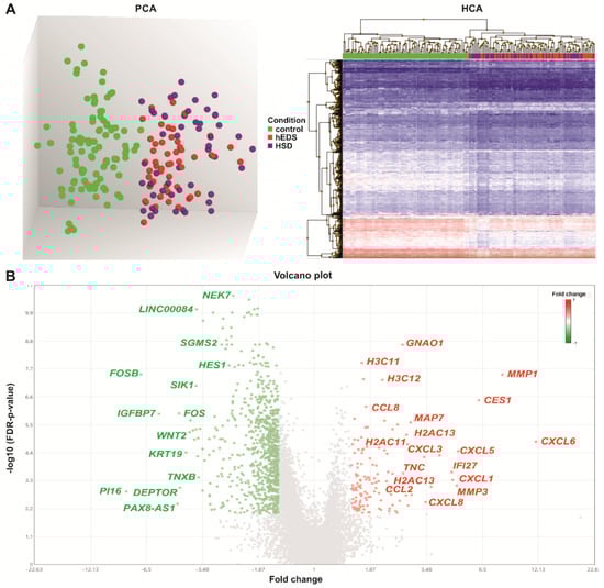 Differential gene expression and functional enrichment analyses. (A) On the left, PCA showing a clear distribution of control (green dots), hEDS (red dots), and HSD (violet dots) samples in two distinct clusters. On the right, HCA of the 952 DEGs identified in hEDS/HSD vs. control with downregulated genes in blue and upregulated ones in red. (B) Volcano plot displaying the distribution of the 826 downregulated (green) and the 126 upregulated (red) DEGs. The plots represent expression values as fold change (x-axis) plotted against the -log10 FDR-adjusted p-value (y-axis). Gene symbols for a selection of DEGs are indicated.