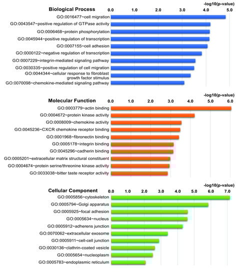 To obtain an overview about localization, function, and related biological processes of the protein products of the significantly enriched genes, we performed GO analysis on the full list of DEGs. Cell migration, positive regulation of GTPase activity, and protein phosphorylation (Biological Process); actin binding, protein kinase activity, and chemokine activity (Molecular Function); cytoskeleton, Golgi apparatus, and focal adhesion (Cellular Component) were the three most enriched GO terms for each category according to the DAVID database. The remaining top 10 GO terms and the complete GO results are available in Figure 3 and Supplementary Table S3.