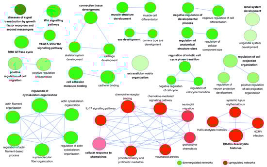 Among upregulated clusters, the most significant group was related to chemokines with enriched GO terms/pathways including “cellular response to chemokines”, “proinflammatory and profibrotic mediators”, “granulocyte chemotaxis”, “neutrophil migration”, “interleukin-17 signaling”, and “rheumatoid arthritis”. The other upregulated network was related to chromatin organization and nucleosome assembly with functional nodes including the pathways “HDACs deacetylate histones”, “HATs acetylate histones”, “systemic lupus erythematosus”, and “HCMV infection”.