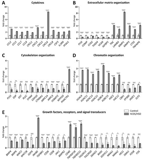 Based on these enrichment analyses, we performed qPCR validation of a set of significant DEGs encoding cytokines, related to ECM, cytoskeleton, and chromatin organization, and coding for different growth factors, receptors, and signal transducers by comparing hEDS/HSD vs. control.