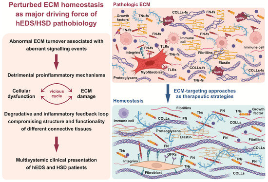 Proposed hEDS/HSD disease model. Schematic representation summarizing the main biological knowledge on molecular mechanisms involved in the hEDS/HSD pathophysiology emerging from the present and our previously published findings [19,22,23]. Abnormal ECM turnover and overproduction of ECM-generated DAMPs act as main triggers in the disease process, sustaining an uncontrolled degradative and proinflammatory vicious cycle affecting homeostasis and integrity of a range of connective tissues, finally leading to the complex clinical manifestation of hEDS/HSD patients. The identification of ECM-related disease drivers may offer ECM-targeting approaches as therapeutic strategies (e.g., doxycycline-mediated MMP inhibition). Abbreviations: COLLs-fs: fragments of collagens; FN-fs: fragments of fibronectin; GFRs: growth factor receptors; MMPs: matrix metalloproteinases; TLRs: Toll-like receptors; TNs-fs: fragments of tenascins. This image was created with BioRender.com.