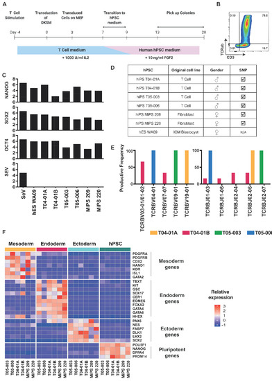 Generation of human iPSCs from T cells. (A) Schematic view of the reprogramming protocols. A total of 105 activated T cells were seeded on day 0, then they were transduced with 3 Sendai viruses expressing polycistronic KLF4/OCT4/SOX2, MYC, and KLF4 at a ratio of 6:6:3.6, respectively. Cells were split among feeders on day 3 and placed in the hPSC media on day 9. Colonies started to appear around day 13, and they were picked on feeders. (B) Representative dot plot of CD3 and TCRαβ on T cells after 4 days of αCD3 and αCD28 mAbs activation. (C) qPCR measurement of Oct4, Nanog, Sox2, and Sendai virus (SEV) expression in the indicated cell lines, one positive control (SeV), and one negative control (hES WA09). (D) Summary of the original cell line, gender, and SNP profiles of the indicated cell lines. A tick mark means that it is identical to parental cells. (E) Analysis of TCR rearrangements in T04-01A, T04-01B, T05-003, and T05006. V, D, and J segment usages in the TCRB gene locus were sequenced and identified using an ImmunoSEQ Analyzer (Adaptive Biotechnologies). (F) The indicated cell lines have been differentiated in the three germ layers (mesoderm, endoderm, and ectoderm) and have been analyzed by RNAseq. Selected gene expressions representative of each germ layer were plotted as a heatmap.