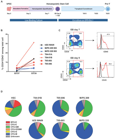 We then subjected hPSCs derived from fibroblast or T cells to HPSC differentiation to better understand their respective potential and included hESCs as controls. The differentiation was started by mesoderm induction, followed by hemogenic endothelium specification to finally yield CD34+CD43+ HPSCs on day 9 (Figure 2A). Overall, all pluripotent cell lines differentiated efficiently, yielding on average 37% of CD34+ cells, although we observed a more efficient generation of CD34+ cells using the T04.01B clone vs. the other clones (Supplementary Materials, Figure S1A). For all tested cell lines, the percentage of the CD34+CD43+ population within the CD34+ cells evolved drastically between day 7 (around 3%) and day 9 (around 13%) (Figure 2C). Among the CD34+ cells, the CD45+ cells increased from 40% on day 7 to 80% on day 9 (Figure 2B,C). We observed variation between the different hiPSC lines; the T04.01B clone was particularly efficient at differentiating compared to all other T cell-derived iPSC clones that behaved similarly to hESC and fibroblast-derived iPSCs. Nevertheless, studies have shown that differences in the differentiation potential are mostly due to the genetic background and gender of each parent cell line [16,17,18] (Supplementary Figure S1A,B).