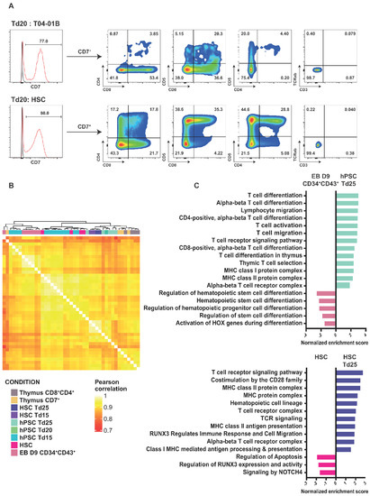 hPSCs-Td25 are closed to CD8+CD4+ thymocytes. (A) Representative histogram of CD7 expression in living cells (excluding OP9) on day 29. Red line represents cells stained with a fluorescent antibody and black line represents unstained cells. The expressions of CD8, CD4, CD3, and TCRαβ among CD7+ cells are shown in dot plot. (B) Heatmap of Pearson correlation coefficients of thymus cells and hPSCs differentiated from hPSCs. (C) Normalized enrichment score of biological pathways upregulated or downregulated in EB D9 CD34+CD43+ compared to hPSC-Td25 (up) and in HSC compared to HSC-Td26 (down). All represented pathways have an adjusted p-value < 0.05.