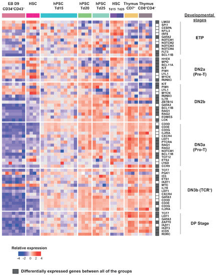 To further understand the developmental stage achieved by the in vitro differentiation of PSCs towards thymic lymphopoiesis, we then analyzed the stage-associated makers (Figure 5 and Supplementary Figure S8). T-cell progression through lymphopoiesis involves progressive phases of lineage specification, characterized by the acquisition of a T cell-specific transcriptional program. The different development stages are characterized as follows: the early intrathymic precursor of the ETP stage; the immediate pre-commitment DN2a stage (DN = double negative for mature T-cell coreceptors CD4 and CD8), also known as the pre-T stage; the newly committed DN2b stage; the DN3a stage that is the first major period of TCR gene rearrangement, also known as the pro-T stage; the DN3b and immature single-positive stages when cells proliferate vigorously following the first successful TCR locus gene rearrangement; and finally, the DP (CD4, CD8 double positive) stage when the second TCR locus is rearranged and cells successfully express their final TCR recognition specificity for the first time. The DP stage is the progenitor stage that gives rise to all effector subsets of T cells using the αβ form of the TCR [31]. We then analyzed genes well known to define the different developmental stages of T cells in the thymus [32,33,34]. Three profiles emerged from this analysis: (1) D9 CD34+CD43+ EBs and CD34+ cord blood HSCs, which overexpressed ETP and DN2a stage-related specific genes and downregulated other stage-related genes, (2) hPSC/HSC Td20, Td25, and thymic cells, which, on the contrary, downregulated ETP and DN2a stage-related genes and upregulated DN2b, DN3a, and DN3b stage-related genes, and (3) hPSCs-Td15, which have a particular intermediate profile (Figure 5). We noticed that the LMO2, GATA2, and MPO genes involved in the ETP and DN2a stages of differentiation [35,36,37] were upregulated in hiPSC-Td15, while they were downregulated in hiPSC-Td25 and HSC-Td25, as well as in CD7+ and CD8+CD4+ thymocytes. (Figure 5). On the other hand, genes such as IKZF3, CD3D, CD3E, RAG1, and RAG2 were significantly upregulated in hPSC-Td20 compared to hPSC-Td15 during differentiation. Similarly, BCL11B, GATA3 [38], IKZF3, and RAG1 were also significantly upregulated in hPSC-Td25 compared to hPSCTd15 and marked the transition to more advanced stages (Supplementary Figures S9 and S10). Moreover, we noticed that they also expressed the BCL11B and LCK genes, which are essential for the passage from DN2 to DN3. Interestingly, we observed that the hPSC/HSC Td20 and Td25 cells expressed RAG1/RAG2, as well as the three chains of CD3 (D/E/G), PTCRA, CD44, and MME, which are involved in the rearrangement of the TCR complex [39,40] (Figure 5 and Supplementary Figure S9). In addition, we could observe that differentiating cells, such as CD8+CD4+ thymocytes, expressed DN3b and DP stage-related genes such as TCF7, ZAP70, IKZF1 (IKAROS), IKZF3 (AIOLOS), or ICOS [41,42,43,44]. We found that there were no significant differences in the expressions of T-lineage genes such as BCL11B, LCK, ZAP70, and PTCRA between hPSC-Td25 and HSC-Td25 compared to CD8+CD4+ thymus, showing their engagement in the T lineage. (Supplementary Figures S9 and S10). We also saw that there were no significant differences in the expressions of these genes between hPSC-Td15 and HSC-Td15 and between hPSC-Td25 and HSC-Td25. T-hPSC-derived cell differentiation, therefore, behaved identically to HSC-derived cells. Since hPSC/HSC-Td20 and Td25 cells did not express the TCR/CD3 complex protein on the cell surface, the differentiation stage reached by hiPSC-Td25 and HSC-Td25 cells 249 was DN3a [45].