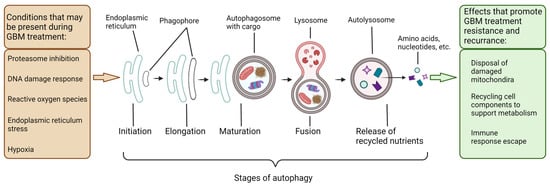 Conditions that lead to the inducement of autophagy in GBM and role of autophagy in treatment resistance in GBM. Conditions (e.g., hypoxia) that induce autophagy and are inherent to GBM, as well as those that may be conditional (e.g., proteasome inhibition), on specific treatments are documented here. The stages of autophagy include initiation of the phagophore at the omegasome, elongation of the double-layer phagophore membrane, sealing and maturation of the autophagosome, and fusion with the lysosome and subsequent cargo degradation with lysosomal acid hydrolases for recycling of the cellular building blocks being released back into the cytosol. Autophagy supports GBM cell survival by removing the damaged mitochondria before they can begin apoptotic signaling, mitigating the effects of hypoxia by recycling resources for the cell, and selective degradation of tumor suppressor proteins and immune signaling proteins.
