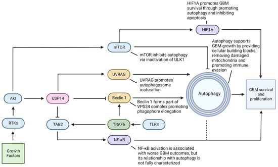 Hypoxia and autophagy work hand-in-hand in promoting cell survival in GBM (Figure 4). Hypoxia-induced HIF1A-mediated autophagy activation occurs through a pathway independent of, but complimentary to, the classical starvation-induced AMP-activated protein kinase (AMPK)/mTOR-mediated pathway, although in case of severe hypoxia both may function concurrently [116]. HIF1A promotes expression of core autophagy genes such as ATG5/7/9A, phosphatidylinositol-4,5-bisphosphate 3-kinase catalytic subunit alpha (PIKC3CA), Beclin 1, Bcl-2-Interacting Protein 3 (BNIP3), and BNIP3 Like (BNIP3L) [117]; the latter two do not have a direct role in autophagy but act to free Beclin 1 from two potent anti-apoptotic proteins, Bcl-2 and Bcl-xL, through competitive binding [118]. Additionally, the HIF1A isoform HIF2A was found to regulate the hypoxia response in GSCs, which were stabilized by USP33 [119].