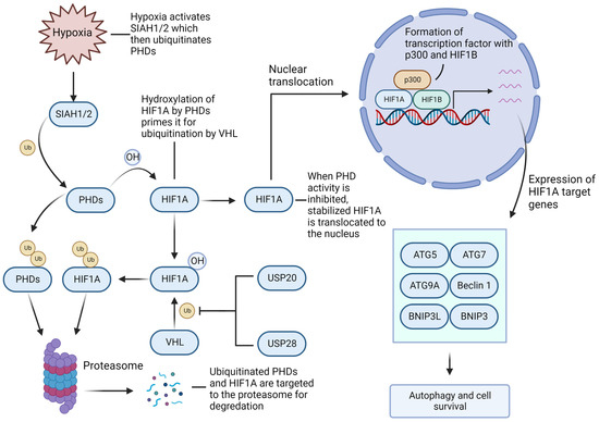 HIF1A is considered the most significant regulator of hypoxic response in GBM, and it interacts and co-operates in a significant way with both UPS and autophagy for tumor growth [11,114]. In the case of normoxia, prolyl hydroxylase domain (PHD) enzymes hydroxylate HIF1A, leading to its ubiquitination by the E3 von Hippel–Lindau (VHL) protein and proteasomal degradation [115]. Hypoxic conditions inactivate PHDs, allowing HIF1A the opportunity to translocate to the nucleus and form a protein complex, which acts as a transcription factor for the genes critical to hypoxia response promoting tumor cell survival [115].