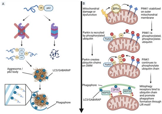 Interactions between the UPS and selective autophagy in GBM. (A) Ubiquitinated proteins destined for degradation are bound by SQSTM1/p62. If UPS is functioning at a sufficient level, SQSTM1/p62 will act as a chaperone guiding the substrate into the proteasome. If UPS function is impaired, substrate-bound SQSTM1/p62 will oligomerize forming an aggresome or SQSTM1/p62 body in the cytosol. The SQSTM1/p62 body is joined by microtubule-associated proteins 1A/1B light chain 3B (hereafter referred to as LC3)/gamma-aminobutyric acid receptor-associated protein (GABARAP) via its LC3-interacting region (LIR) motif, which subsequently attracts the autophagy machinery to facilitate degradation. Protein aggresomes can become cytotoxic if allowed to accumulate. (B) Selective autophagy of mitochondria (mitophagy) is normally active at a low level in most cells but becomes activated when mitochondria become damaged (such as mtDNA damage from radiation) or otherwise dysfunctional. Mitochondria respond to damage through disruption of mitochondrial membrane potential (ΔΨm), allowing PTEN-induced kinase 1 (PINK1) to accumulate on the outer mitochondrial membrane (OMM). PINK1 proceeds to phosphorylate ubiquitin (Ub), attracting Parkin (a 465-amino acid residue E3 ubiquitin ligase), which is then also phosphorylated and activated. Parkin then begins building ubiquitin chains on OMM proteins, which PINK1 continues to phosphorylate. The phosphorylated ubiquitin chains then recruit mitophagy receptors including nuclear dot protein 52 (NDP52) and optineurin (OPTN). These mitophagy receptors then bind to LC3/GABARAP via their LC3 interacting region (LIR) motif. LC3/GABARAP then recruits autophagy initiation machinery such as the Unc-51 Like autophagy activating Kinase 1 (ULK1) to begin forming a phagophore around the cargo leading to degradation.