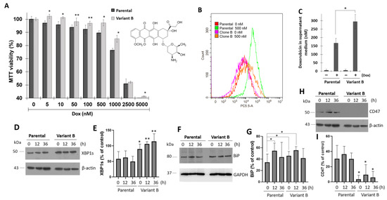 Chemoresistance induced by Doxorubicin (Dox) is associated with UPR activation. (A) MTT assay in parental and variant B cells, mean values are presented (n = 6, mean ± SD), * p < 0.001, ** p < 0.05, respect to variant cells. Dox structure is shown. (B) Cytometer analysis under 500 nM of Dox-treatment in parental cells and variant B. Under the same condition, fluorometer analysis of Dox in supernatant medium (C), mean values are presented (n = 3, mean ± SD), * p < 0.05 compared to the control. (D) WB analysis of XBP1s in a Dox 500 Nm temporal curse (0–36 h), densitometry analysis of XBP1s is shown (E). Under the same temporal curse, evaluation of BiP (F,G) and CD47 expression (H,I). In densitometry analysis of proteins, mean values are presented (n = 3, mean ± SD) and expressed as % of control, * p < 0.05, ** p < 0.01. β-actin and GAPDH were used as a loading control.