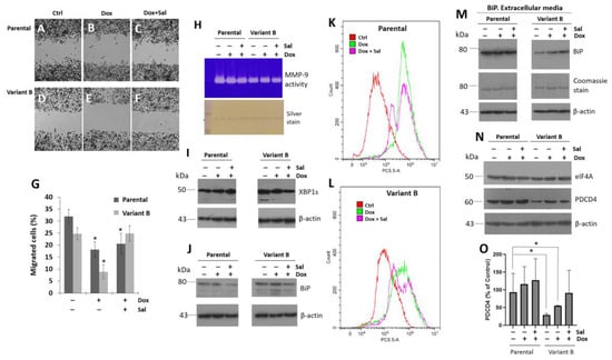 Chemoresistant cells showed a reduced migratory capacity coupled with PDCD4 dysregulation. Representative images of the wound-healing assay in parental cells corresponding to control (A), Dox treatment (500 nM) (B), and concomitant Dox (500 nM) and Sal (25 µM) treatment (C). The same assay in variant B, control (D), Dox treatment (E), and concomitant Dox and Sal (F). (G) Wound-healing results expressed as percentage respect to controls in parental and variant B cells. Mean values are presented (n = 3, mean ± SD); * p < 0.01 respect to controls. (H) Under the same conditions, MMP-9 secretion was analyzed on a conditioned medium using gelatin-substrate gels. The silver stain was employed as a loading control. WB analysis of XBP1s (I) and BiP (J) on parental cells and variant B, under treatment with Dox (500 nM) and Sal (25 µM). Dox characterization by cytometer analysis in parental cells (K) and variant B (L) under Dox (500 nM) and Sal treatment (25 µM). (M) BiP expression in extracellular media of parental cells and variant B under Dox (500 nM) and Sal treatment (25 µM). β-actin and Coomassie stain on PVDF membranes were used as controls. (N) At the same conditions, WB of eIF4A and PDCD4. (O) Densitometry analysis of PDCD4, results are reported as mean ± SD (n = 3) and expressed as % of control; * p < 0.05 respect to control. β-actin was used as a loading control in WB experiments.