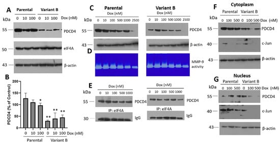 Doxorubicin (Dox) induces the disruption of PDCD4/eIF4A complex. (A) WB of PDCD4 and eIF4A under 10 and 100 nM Dox treatment in parental cells and variant B. (B) Densitometry analysis of PDCD4, results are reported as mean ± SD (n = 3) and expressed as % of control; * p < 0.1, ** p < 0.001 respect to control of parental cells. (C) PDCD4 expression is affected by increasing doses of Dox (0–2500 nM) in both, parental and variant B cells. Under the same conditions, MMP-9 secretion was analyzed on a conditioned medium using gelatin-substrate gels (D) and the interaction of PDCD4/eIF4A complex (E). (F,G). Cellular localization of PDCD4 and c-Jun in parental and variant B cells, under increasing concentrations of Dox (0–500 nM). β-actin was used as a loading control, and Lamin B1 in nucleus fractions.