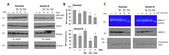 Chemoresistance is regulated by a terpene-derived molecule and ER-stress inducer compound. (A) Effect of concomitant Dox (100 nM) treatment with Salubrinal (Sal) (25 µM), Cryptotanshinone (Cry) (25 µM), and Tunicamycin (Tum) (1 µg/mL) on the expression of eIF4A, PDCD4, and characterization of protein interaction. (B) Employing the same conditions, cellular viability was evaluated in parental and variant B cells under the Dox treatment with Sal, Cry, and Tum. Mean values are presented (n = 6, mean ± SD), * p < 0.005 with respect to the control. (C) MMP-9 secretion was analyzed on supernatant medium using gelatin-substrate gels and the MMP-9 expression by WB. Membranes were processed by Coomassie stain as a loading control.