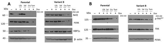 Doxorubicin (Dox) chemoresistance is associated with PERK/Nrf2 activation and regulated by cryptotanshinone (Cry). (A) Expression of Nrf2 under the Dox treatment (250 nM) and concomitant LDL (10 µg/mL), Sal (25 µM), Cry (25 µM), and Tum (1 µg/mL) in parental and variant B cells. In this experiment, XBPIs role was confirmed in variant B. β-actin was used as a loading control. (B) Under the same conditions, characterization of FAK pathway, evaluated by the expression of FAK and its phosphorylation at Tyr-397 (p-FAK397). PCNA was used as a loading control.