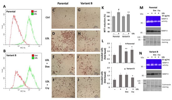 Cry treatment inhibits LDL-induced cellular invasion. Dil-LDL internalization by cytometer analysis in parental (A) and variant B (B) cells. Representative images of invasion experiments were obtained by optical microscopy, employing Boyden chambers. In parental cells, representative image corresponding to control (C), LDL treatment (20 µg/mL) (D), LDL and Dox (500 nM) (E), LDL and Cry (25 µM) (F). The same assays showed in variant B, control (G), LDL treatment (H), LDL and Dox (I), LDL and Cry (J). Bars correspond to 200 µm. (K) Cellular viability in the two variants under the LDL treatment (20 µg/mL). Mean values are presented (n = 3, mean ± SD), # p < 0.001, ** p < 0.01 with respect to control. (L) Semi-quantitative analysis of invasion experiments in parental and variant B cells, graphs are expressed as the fold of control. Mean values are presented (n = 3, mean ± SD), * p < 0.05 with respect to LDL treatment, ** p < 0.01 with respect to LDL treatment. Effect of Dox (500 nM) and Cry (25 µM) on LDL induced-MMP-9 secretion in parental (M) and variant B (N) cells, activity was analyzed on the supernatant medium using zymogram gels and the expression of MMP-9 by WB. Membranes were processed with Coomassie stain as an experimental loading control.