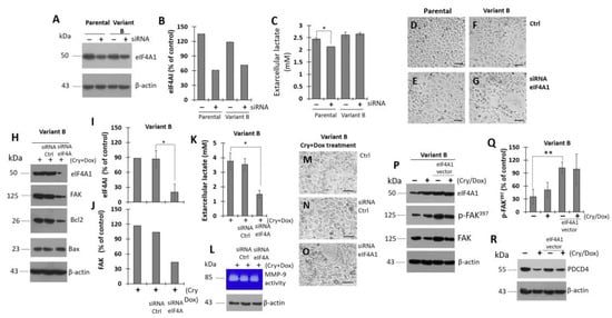 Regulation of eIF4A on FAK is inhibited by concomitant treatment of Dox and Cry. Efficiency of siRNA incubation (80 nM) on the expression of eIF4A1 in parental and variant B at 24 h. (A) WB of eIF4A1 in parental cells and variant B and densitometry analysis of eIF4A1 (B); (C) under the same conditions, lactate concentrations in supernatant media, results are reported as mean ± SD (n = 3), * p < 0.01, respect to control. Optical microscopy images corresponding to control (D) and siRNA-eIF4A treated parental cells (E); for variant B, control cells (F) and siRNA-eIF4A1 treatment (G). In controls, the transfection vehicle was evaluated. Bars correspond to 200 µm. (H) Effect of siRNA-eIF4A1 on the expression of FAK, Bcl2 and Bax under the concomitant treatment of Cry (25 µM) and Dox (500 nM) for 60 h in variant B; densitometry analysis of eIF4A1 (I) and FAK (J), results are reported as mean ± SD (n = 3) and expressed as % of control; * p < 0.01 respect to control. Under the same transfection conditions and concomitant Cry and Dox treatment, evaluation of lactate in supernatant media (* p < 0.01 respect to control) (K), MMP-9 activity (L), and representative cellular images of control (M), siRNA control (N), and eIF4A1-siRNA (O). Bars correspond to 200 µm. (P) Effect of the eIF4A1 overexpression on FAK expression and activity (p-FAK397) employing an eIF4A1 vector (GenScript, ID: U533ZGE280-1). Results showed the effect of Cry (25 µM) and Dox (500 nM) treatment for 24 h. (Q) densitometry analysis of p-FAK397, results are reported as mean ± SD (n = 3) and expressed as % of control; ** p < 0.05 respect to control. (R) Under the same conditions, WB of factor PDCD4. In panels A, H, L, P, and R, β-actin was used as a loading control.