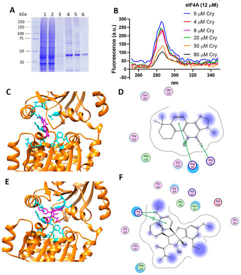 We next sought to characterize the regulatory effect of Cry on eIF4A (Figure 8). Therefore, the overexpression of eIF4A was evaluated in several strains of E. coli under a variety of experimental conditions. The BL21 (DE3) pLysS, BL21 (DE3), and Rosetta-Start E. coli strains harboring plasmid pET-19b-mod-eIF4A were examined to select the optimal host for protein production. The Rosetta-Star strain had the best protein production yield. Proteins were obtained from the soluble fraction and purified by affinity chromatography, after which the PreScission protease was used to remove His tags (Figure 8A). Our process was validated through western blot analyses in several samples, confirming a pure fraction corresponding to eIF4A1. The purity of the isolated soluble protein was higher than 90% (Figure 8A). Therefore, we next performed protein-ligand interaction assays using a fluorescence-based method. Purified eIF4A protein (12 µM) and Cry (0–80 µM) were incubated at 25 °C for fluorescent synchronic characterization, and an emission peak was detected near 285 nm. Incubation with Cry resulted in a quenching phenomenon, suggesting that Cry interacted with eIF4A1 (Figure 8B). Particularly, a critical reduction in fluorescence values was observed at a Cry concentration of 20 µM and quenching was evident at a Cry/eIF4A molar ratio of 4:1.