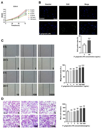 LPS derived from P. gingivalis promoted the proliferation and migration of GL261 glioma cells. (A) P. gingivalis LPS promoted cell viability at concentrations ranging from 10 to 1000 ng/mL (two-way ANOVA, n = 5). (B) P. gingivalis LPS (100 ng/mL) increased the rate of EdU positive cells (unpaired t-test, n = 6). (C,D) P. gingivalis LPS promoted cell migration at concentrations ranging from 100 to 1000 ng/mL according to the wound-healing assay (one-way ANOVA, n = 6) and the transwell migration assay (one-way ANOVA, n = 5). ns: no significance; * p < 0.05; ** p < 0.01; *** p < 0.001 vs. untreated cells (0 ng/mL).
