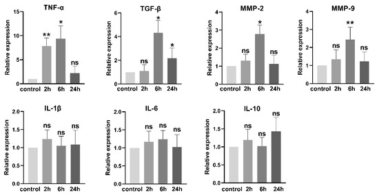 P. gingivalis LPS (100 ng/mL) treatment increased the mRNA levels of inflammatory cytokines and invasion-related MMPs. ns: no significance; * p < 0.05; ** p < 0.01; one-way ANOVA, n = 6.