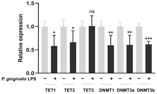 Epigenetic modulations are regarded as a profoundly supplementary mechanisms determining the way in which chronic inflammatory diseases affect multiple systemic disorders [28]. Previous studies showed that P. gingivalis LPS could alter the gene expression of the DNA methyltransferase family (DNMTs) and ten-eleven translocation proteins (TETs) in vitro [29,30,31]. Here, we investigated the mRNA expression levels of the two common epigenetic enzymes. As shown in Figure 5, the mRNA levels of DNMTs, TET1, and TET2 were significantly attenuated after exposure to P. gingivalis LPS for 24 h.