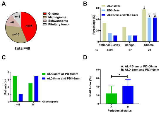The association between poor periodontal status and glioma. (A) The proportion of different brain tumors exhibited by the patients enrolled in the study. (B) The patients with glioma had a higher prevalence of poor periodontal status than those with benign tumors or those from the Chinese population in the 4th national survey. * p < 0.05; ** p < 0.01; *** p < 0.001 vs. national survey; # p < 0.05 vs. benign tumors, Chi-squared test). (C) The patients with WHO IV grade glioma tended to exhibit poorer periodontal condition (the presence of both AL > 5 mm and PD ≥ 6 mm) compared with those with lower tumor grades (58.3% vs. 22.2%, p = 0.1842, Chi-squared test); (D) The glioma patients with poorer periodontal condition (the presence of both AL > 5 mm and PD ≥ 6 mm) exhibited a higher Ki-67 labeling index than those with better periodontal condition (41.43% vs. 24.25%, p = 0.0449, unpaired t-test); * p < 0.05.