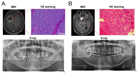 The representative MRI, histological staining, and oral X-ray images of patients with GBM and benign tumors. (A) A 56-year-old male patient diagnosed with glioblastoma showed a 6 mm pocket depth maximum, a 7 mm attachment loss maximum, multiple tooth loss by oral examination, and deep alveolar bone resorption by X-ray examination, indicating the comorbidity of severe periodontitis. (B) A 63-year-old male patient diagnosed with meningioma showed better periodontal health according to the periodontal examination and X-ray images.