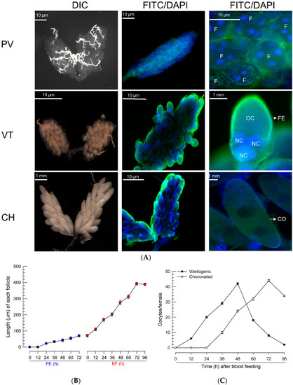 Oocyte development of Ae. albopictus females. (A) Three developmental stages of oocytes: previtellogenic (‘PV’), vitellogenic (‘VT’), and chorionated (‘CH’). Ovaries were observed at differential interference contrasts (‘DIC’). Their cells were stained with FITC-tagged phalloidin (green) and DAPI (blue). Follicles (‘F’) were visible at the PV stage. At the VT stage, oocyte (‘OC’) and nurse cell (‘NC’) can be seen to be enclosed with follicular epithelium (‘FE’). At the CH stage, the oocyte can be seen to be chorionated (‘CO’). (B) Follicle growth in ovaries post-adult emergence (‘PE’) or post-blood feeding (‘BF’). (C) Oocyte development. Total ‘VT’ and ‘CH’ oocytes were counted under a stereomicroscope at the selected time points, up to 96 h post-BF. For each treatment, 10 females were used to analyze follicle growth and oocyte development.