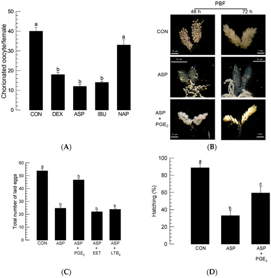 Our results propose a novel endocrine signal that uses PGs in mosquito oogenesis. In insects, the first report on the reproductive role of PG concerned the egg-laying behavior of house cricket (Acheta domesticus) females [45]. Loher [46] analyzed PGE2 levels in females and found a significant increase in hormone levels after mating. The PGE2 levels in mated females are much higher than those in the male reproductive organ. This led to a hypothesis of PG-synthetic machinery transfer during mating, wherein males transfer PGE2-biosynthetic enzymes in the spermatophores, and the mated females subsequently synthesize PGE2 in the spermathecae to release PGE2 to the hemolymph. Moreover, Loher et al. [6] showed that cricket spermatophores exhibited PGE2 biosynthetic activity that was specifically inhibited by aspirin. In addition to the egg-laying behavior, PGs mediate vitellogenesis by stimulating nurse cell dumping in insect reproduction. The finding of this PG signal expands our understanding of mosquito oogenesis, as modulated by JH, 20E, and ILP. The inhibition of egg development by ASP also holds great promise as a novel control strategy against important mosquito vector species. In the current study, orally administered ASP interfered with egg development, thus demonstrating its potential application in reducing mosquito populations. Moreover, PGs are likely to play crucial roles in the gut immunity of mosquitoes against microbiota [16]. The inhibition of PG production by ASP treatment might also impair mosquito immunity, thus making mosquitoes more susceptible to microbial pathogens. Therefore, designing and synthesizing ASP derivatives might have potential in the development of highly potent mosquitocidal agents.