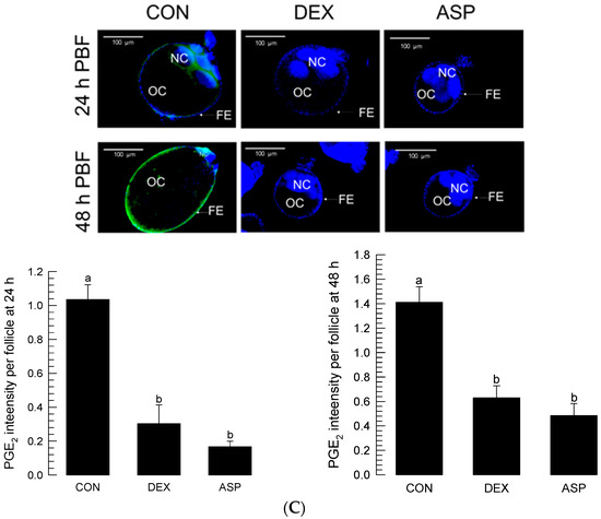 The inhibitory activity of ASP against oogenesis allowed us to monitor the presence of PGE2—a well-known PG in mosquitoes [16]—in the ovaries (Figure 3). The PGE2 signal was detected in the growing ovaries after BF (Figure 3A). Before BF, more than half of the volume of a follicle was filled with nurse cells (Figure 3B). BF stimulated growth in the oocyte size, along with a relative reduction in nurse cells. At 48 h after BF, there was only a tiny relic of nurse cells, which were presumably undergoing nurse cell dumping to the growing oocytes. During the nurse cell degeneration, the PGE2 signal was kept in both nurse cells and follicular epithelium in the growing follicles (Figure 3C). However, DEX or ASP treatment significantly (p < 0.05) reduced the PGE2 signal intensity. Under the reduced PGE2 signals, the oocytes did not grow in size, and the nurse cells were retained in the follicles.
