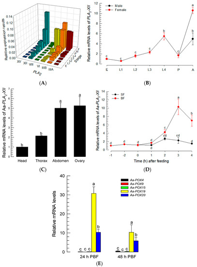 Prediction of PLA2 and COX-like POX genes in PG biosynthesis of Ae. albopictus. (A) Expression profiles of six Aa-PLA2s at different developmental stages: ‘E’ for egg, ‘L1-L4′ for 1st-4th instar larvae, ‘P’ for pupa, ‘M’ for male, and ‘F’ for female. Expression levels of Aa-PLA2-IIIA (‘IIIA’), Aa-PLA2-IIIB (‘IIIB’), Aa-PLA2-VI (‘VI’), Aa-PLA2-VIII (‘VIII’), Aa-PLA2-XII (‘XII’), and Aa-PLA2-XV (‘XV’) were analyzed by RT-qPCR. (B) Expression profiles of Aa-PLA2-XII in male and female mosquitoes. ‘A’ stands for adults. (C) Expression profile of Aa-PLA2-XII in the different tissues of adult female mosquitoes. (D) Effects of sugar-feeding (‘SF’) and blood-feeding (‘BF’) on the expression of Aa-PLA2-XII. (E) Expression profiles of five Aa-POX genes PBF. Each treatment was replicated three times with independent tissue preparations. The different letters above the standard error bars indicate significant differences among means at Type I error = 0.05 (LSD test).
