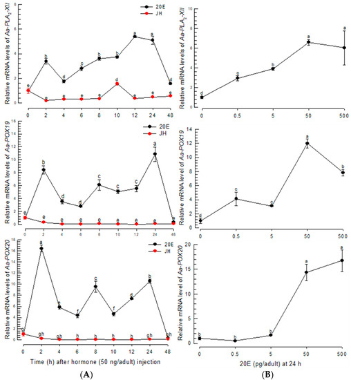 The three PG biosynthetic genes were found to be highly inducible to BF. BF up-regulates 20E to initiate oogenesis in mosquitoes [28]. This suggests that 20E controls PG biosynthesis after BF. To test this hypothesis, 20E was assessed to control the expressions of PG biosynthetic genes (Figure 5). The 20E injection without BF significantly (p < 0.05) induced the expressions of the PG biosynthetic genes, while JH treatment did not (Figure 5A). The up-regulation of the genes was maintained at least 24 h after 20E injection. Moreover, 20E controlled the gene expressions in a dose-dependent manner (Figure 5B). However, a high (500 pg/adult) concentration of 20E was less active in inducing Aa-POX19 expression.