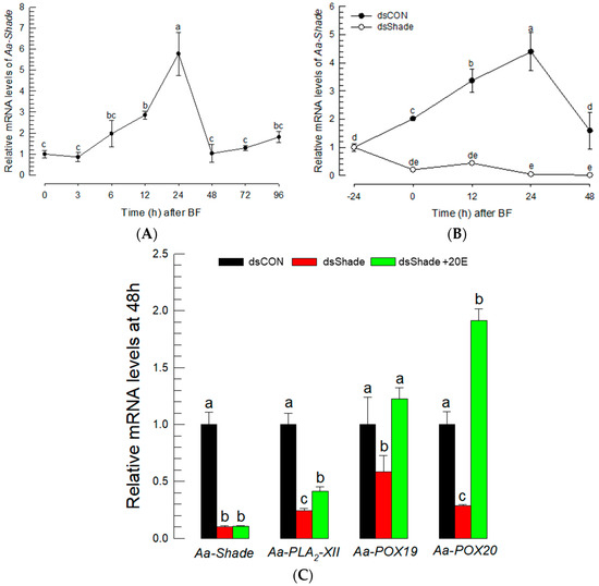 A loss-of-function approach using RNAi was applied to confirm the effect of 20E to control the expressions of PG biosynthetic genes. A 20E biosynthetic gene—Aa-Shade—was selected from the genome of Ae. albopictus and annotated to catalyze the conversion of ecdysone to 20E (Figure S4). Aa-Shade has the same sequence similarity as other dipteran insects (Figure S4A), and it possesses functional domains, such as heme- or NADPH-binding domains typical to monooxygenases, that form 20E from ecdysone (Figure S4B). Its expression in Ae. albopictus was inducible in BF (Figure 6A). However, the injection of dsRNA specific to Aa-Shade suppressed its inducible expression levels (Figure 6B). Under this RNAi condition, three PG biosynthetic genes were assessed in their expressions after BF (Figure 6C). The three PG biosynthetic genes were not induced in their expression levels, even after BF under the RNAi condition. However, the inducible expressions were rescued by the addition of 20E, while Aa-Shade expression was not.