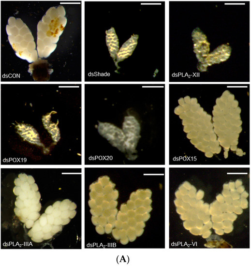 The 20E regulation of PG biosynthetic gene expressions suggested that 20E/PG biosynthetic genes are required for Ae. albopictus oogenesis. To test this hypothesis, individual RNAi treatments against these genes were performed through the injection of gene-specific dsRNAs, and these treatments resulted in significant reductions in their target gene expression levels (Figure S5). The RNAi treatments against target genes significantly inhibited oogenesis, while those against other non-target genes did not have such an effect on the oogenesis (Figure 7). For example, RNAi of Aa-Shade significantly suppressed oogenesis (Figure 7A). Among six PLA2s of Ae. albopictus, four PLA2s were expressed in adults, and their RNAi treatments were compared, in terms of suppressing oogenesis. Only two RNAi treatments specific to Aa-PLA2-IIIB or Aa-PLA2-XII significantly (p < 0.05) suppressed oogenesis, where the RNAi of Aa-PLA2-XII was more effective than Aa-PLA2IIIB in suppressing oogenesis (Figure 7B). Either RNAi specific to Aa-POX19 or Aa-POX20 significantly suppressed the oogenesis. However, RNAi specific to non-PG biosynthetic peroxidase (Aa-POX15) did not have any adverse effect on the oogenesis.