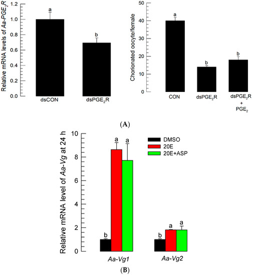The stimulating effect of PGE2 on oogenesis suggests that there is a PGE2R on the follicles of Ae. albopictus. The interrogation of the Ae. albopictus genome with the M. sexta PGE2 receptor sequence [29] allowed us to predict a PGE2R gene (Aa-PGE2R). Aa-PGE2R encoded 398 amino acid residues and 7 transmembrane domains (Figure S6A). Its predicted amino acid sequence was clustered with other vertebrate EP4 receptors (Figure S6B). Aa-PGE2R was expressed in all developmental stages (Figure S7A). It was highly expressed in adult females (Figure S7B). In female adults, it was shown to be highly expressed in the ovaries. The expression of Aa-PGE2R in the ovaries increased with egg production (r = 0.9972; p < 0.0001) (Figure S7C). dsRNA specific to Aa-PGE2R significantly (p < 0.05) suppressed its expression level when it was injected into teneral female adults (Figure 8A). Compared to control females, RNAi-treated female adults failed to develop egg production. PGE2 addition to RNAi-treated females did not rescue the reduction in egg production.