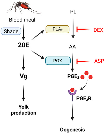 Female mosquitoes depend on blood-feeding (BF) to initiate egg development, which is mediated by several endocrine signals [3]. Insulin-like peptides can sense nutrient availability and stimulate the proliferation of germline stem cells [4]. The juvenile hormone (JH) acts as a main gonadotropic endocrine signal by activating vitellogenesis by the fat body to be competent to synthesize vitellogenin (Vg) in response to 20-hydroxyecdysone (20E) after BF [5]. Prostaglandins (PGs) have also been implicated in stimulating oviposition in some crickets, as PG-synthetic machinery is delivered from males during mating to produce massive amounts of PGs in female spermathecae [6]. The reproductive role of PGs is extended to mediate oogenesis in the fruit fly, Drosophila melanogaster, wherein PGE2 facilitates a nurse cell-dumping process to growing oocytes, in which a nurse cell cytoplasm is dumped into the oocyte [7]. PGE2 has also been shown to mediate eggshell protein synthesis during choriogenesis in several insects [8,9,10].