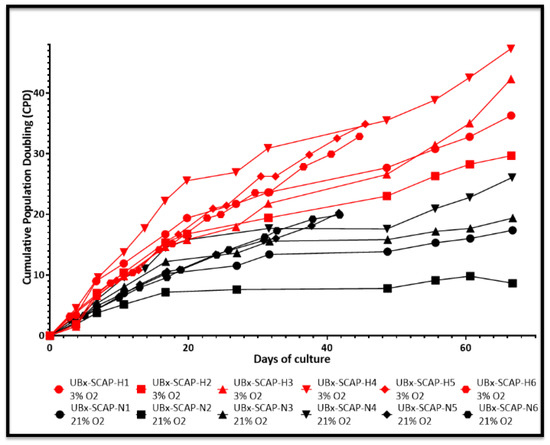 We next explored the effect of O2 concentration on SCAP amplification in vitro. Six banks were derived using an established procedure [13]. We then followed the growth curve of these new banks (named UBx-SCAP-N4-6 (derived and amplified at 21% O2, black curves) or UBx-SCAP-H4-6 (derived and amplified at 3% O2 red curves)) along with those previously reported (N1-3 and H1-3), [13], for 45 to 65 days (Figure 2). Growing cells at low O2 concentration conferred a proliferative advantage. In addition, low O2 concentration enabled cells to be grown for longer period of time (more passages) without entering in senescence (Figure 2 and data not shown). Heterogeneity was noticed between the six 13–15-year-old healthy donors. In addition, we investigated the stability of these banks over time and showed that after several freeze/thaw cycles (at least three cycles), the proliferative advantage was kept (Figure 3) along with the high expression of CD49f and SSEA4 markers at 3% O2 (Figure S2).