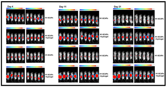 Bioluminescence imaging of mice analyzed 4, 11 or 21 days after sub-cutaneous injection of SCAPs. The quantity of surviving SCAPs-Luc+ from donor 1 grown at 21% (N1-SCAPs) or 3% O2 (H1-SCAPs), and injected alone or included in the hydrogel was measured by luminescence. It was measured for 3 min at the same gain for all mice (n = 10/condition). The Luc measurements were used to draw graphs shown in Figure 6.