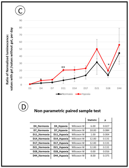 Stem cells are influenced by the local environmental physical and biochemical cues within their niches. Hydrogels are attractive materials able to mimic the complex microenvironment of cells and tissues [32,33,34]. The stiffness, viscoelastic properties and topography of the extracellular matrix (ECM) are instrumental in controlling stem cell fate. Natural polymer (chitosan, collagen, alginate)-based hydrogels are promising 3D scaffolds as artificial tissues because of their biocompatibility, biodegradability and tissue-equivalent construction [35,36,37]. A new generation of injectable thixotropic hydrogels, which gel efficiently at 37 °C and re-liquefy upon mechanical constraints, have been recently commercialized. Some of these gels are enriched in ECM proteins or with various types of peptides, enabling specific properties for tissue repair [38,39]. We used one of them, enriched in ECM components, to test the impact of the preconditioning of SCAPs under low O2 concentration in a subcutaneous engraftment model [34,40,41,42,43,44,45].