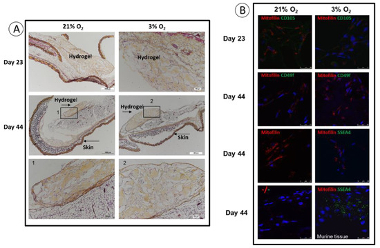 A major goal in stem cell research is to optimize the conditions for cellularized biomaterial implantation, for tissue repair towards clinical applications. We have set up a procedure in an animal model in which a commercial thixotropic hydrogel (VitroGel Matrix) is mixed with SCAPs preconditioned at either 21% or at 3% O2. SCAP banks N1 and H1, which display, as the other banks, an important difference in cell proliferation at 21% compared to 3% O2 (Figure 2), were transduced with lentivirus expressing luciferase (SCAPs-N1-Luc+ and SCAPs-H1-Luc+). Cells either alone or in combination with the hydrogel, were injected subcutaneously in immunodeficient NSG mice. The quantification of luciferase activity, assessing cell survival, was performed regularly over a 44 days period. Figure 5 shows images of the mice with the injected SCAPs-Luc+ at different time points. Survival of the SCAPs-Luc+ decreased over time within the first two weeks when injected alone and survived unexpectedly better, up to day 11, when grown at 21% O2, than at 3% O2 (Figure 6A,B and Figure S3). A higher survival rate was observed with the cells injected in association with the hydrogel (Figure 6A,B), but no statistical difference was obtained between the two oxygen concentrations when pre-seeded in the thixotropic hydrogel. However, we noticed that the protective effect of the hydrogel was greater for cells preconditioned at 3% O2 when comparing the ratio of luminescence of cells with or without hydrogel at 21% or 3% O2 (Figure 6C,D). We then characterized the cellularized grafts recovered from mice after two time periods at day 23 (three mice per condition were sacrificed) and at day 44, (final point of the experiment). HES staining allowed to determine the presence of the hydrogel in the sections and we could detect it in all the analyzed mice up to 44 days. This indicates a good biocompatibility of the hydrogel well supported by the animals. In addition, we could easily detect the presence of cells in the hydrogel after both 23 and 44 days (Figure 7A). Immunolabelling of sections with human mitofilin (a mitochondrial protein with an antibody specific of the human protein), with CD105, CD49f, SSEA4, and Ki-67 demonstrated that all cells present in the hydrogel were of human origin (Figure 7B). In contrast, neither MSC markers (CD90 and CD105) nor SSEA4 or CD49f were detected in the mitofilin positive areas, indicating that SCAPs-Luc+ cells, within the mice skin, could survive and had lost their MSC phenotype (Figure 7B and data not shown). The only labelling with SSEA4 was found in some areas of mice tissues that we did not characterize further. In addition, we could not detect dividing cells (no Ki-67 positive cells) indicating that the surviving cells were quiescent in the graft after 44 days. These results showed that VitroGel matrix represents a suitable easily injectable cell support that ensures cell survival. However, conditions for better long-term survival of SCAPs can still be improved.