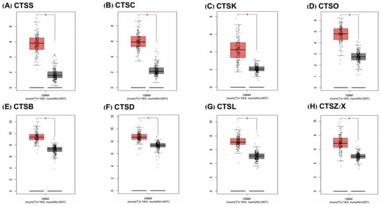 Cathepsin mRNA expression is upregulated in GBM patients. (A–H) Compared with normal tissues, CTSS, CTSC, CTSK, CTSO, CTSB, CTSD, CTSL, and CTSZ/X are highly expressed in tumors. Number of tumor samples (n = 163); number of tissue samples (n = 207). The red boxplot represents the tumor, and the grey boxplot represents the normal tissue. The data are presented as the mean ± SD, * p < 0.05.