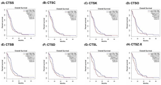 Cathepsin mRNA expression level in the OS of GBM patients. (A–D) The expressions of CTSS, CTSC, CTSK, and CTSO were not significantly associated with shortened overall survival in GBM patients (p > 0.05). (E–H) The expressions of CTSB, CTSD, CTSL, and CTSZ/X were significantly associated with shorter overall survival in GBM patients (p > 0.05). Number of tumor samples (n = 162).