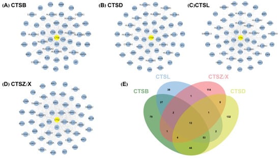 Top 50 PPIs of CTSB (A); CTSD (B); CTSL (C); CTSZ/X (D); Overlapping interacting proteins of four cathepsins (E).