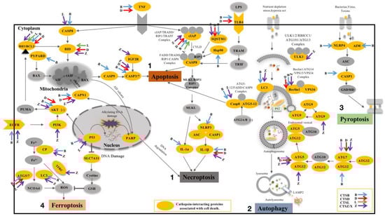 CTSZ/X contains the domain of peptidase-C1, also belongs to cysteine peptidase family C1, subfamily C1A, exhibits carboxymonopeptidase and carboxydipeptidase activities, and is involved in maintaining homeostasis and immune cell function [56,57] (https://smart.embl.de/smart/, accessed on 30 December 2021). CTSZ/X is involved in cell death via interacting proteins (Figure 4, purple arrows). CTXZ/X plays a critical role in apoptosis, necroptosis, ferroptosis, and autophagy.