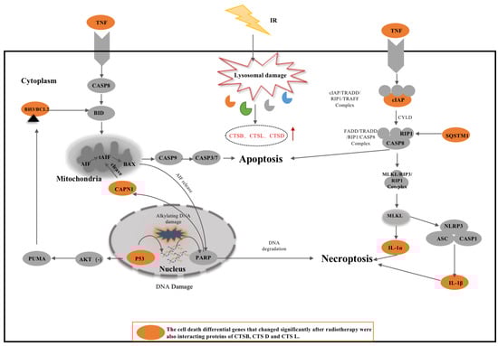 Differentially expressed CTSB, CTSL, and CTSD-interacting proteins after RT are involved in cell death. The orange circles represent the differentially expressed CTSB, CTSL, and CTSD-interacting proteins after RT.