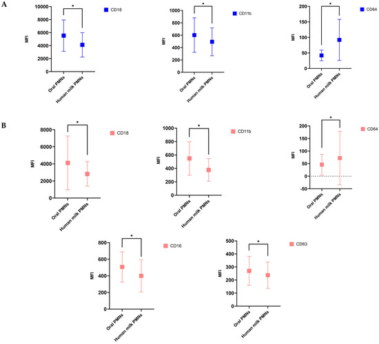 In this study, we reported new findings regarding the differences in the activation states between PMNs found in the oral cavity and human milk (Figure S4). This difference in the activation states between hmPMNs and oPMNs might be due to the shedding of these molecules/markers when they move from the blood and pass through the mammary gland and into human milk [44]. Studies also reported that human milk contains inhibitors which affect the activity and function of PMNs during lactation [18,45], since it has been reported that in human milk, PMNs ingest fat globules and casein micelles resulting in the loss of their cytoplasmic granules and altering the PMNs phagocytic capacity and bactericidal activities [45,46]. However, CD64 biomarker was elevated on hmPMNs compared to oPMNs at both timepoints, suggesting that there might be a unique role for the high-affinity Fc-receptor, CD64, on hmPMNs, for example in strengthening antibody-mediated protection in the new-born infant. The expression of the CD64 marker on blood PMNs is being investigated as a potential screening marker for the detection of infection in infants [47]. Therefore, the CD64 biomarker, being expressed highly on hmPMNs compared to oPMNs can point to a potentially crucial role in fighting infections in neonates.