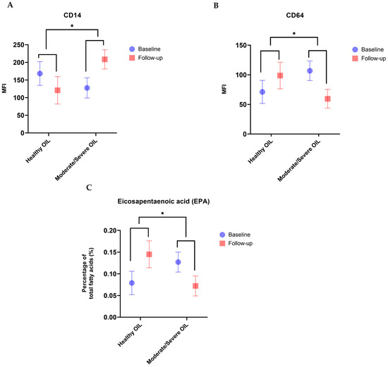 Differences in CD14 (A) and CD64 (B) expression levels and levels of n-3 poly-unsaturated fatty acid (PUFA); eicosapentaenoic acid (EPA) (C) between mothers with moderate/severe OIL and mothers with healthy OIL during lactation. Mothers with moderate and/or severe OIL at baseline and follow-up showed higher expression levels of CD14 (A) and lower expression levels of CD64 (B) biomarkers and lower levels of EPA n-3 PUFA (C) at follow-up compared to baseline, compared to mothers with healthy OIL. * denotes p-value ≤ 0.05. Data are presented as Mean ± SD.