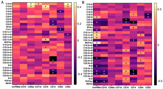 Heat map of correlation coefficients between human milk neutrophils (hmPMNs) and expression of CD markers, along with the fatty acids (FAs) content in human milk at baseline (A) and follow-up (B). The rows represent the FAs in human milk. Columns represents the hmPMNs and CD markers expression levels. The range of values is represented by the colour key. * denotes p-value ≤ 0.05.