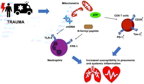 Our own recent work has provided evidence that, in an in vivo model, whole intact circulating mitochondria, administered prior to bacteria instillation, induce severe lung injury and impair antibacterial host response in mice. Moreover, extracellular intact mitochondria are functionally active in generating ATP []. ATP is a well-known danger molecule, which can elicit pro-inflammatory responses by activation of P2X7 and inflammasome signaling [,]. To counterbalance this, high levels of extracellular ATP lead to the upregulation of ecto-enzymes CD39 and CD73 with rapid conversion into immunosuppressive adenosine []. In our in vivo study, we also showed that mice administered with extracellular intact mitochondria exhibited high proportions of exhausted CD8 T cells, i.e., expressing high levels of CD39, Programmed cell death protein-1 (PD-1) and T-cell immunoglobulin and mucin-domain containing-3 (Tim-3). Notably, human data indicated an association between trauma patients developing systemic inflammation and exhausted CD8 T cell phenotype [] (Figure 1).